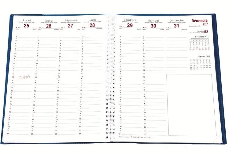 L'agenda publicitaire semainier débute à la mi novembre et fini à la mi janvier.