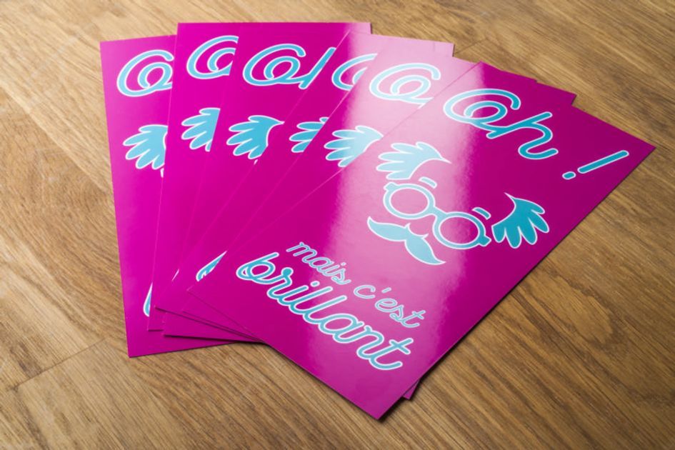 flyers finition luxe ultra brillant, impression quadri recto et verso sur 250g.m² couché brillant + vernis ultra brillant recto et verso
