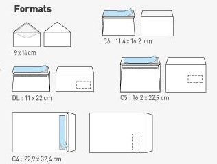 Les enveloppes standards sont en 90g.m², 100g.m² ou 120g.m² en papier blanc, sans fenêtre ou avec fenêtre 45x100mm, en formats standards, fermeture adhésive avec bande de protection sauf pour l'enveloppe 9x14cm, impression recto uniquement