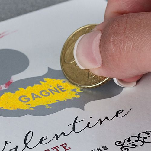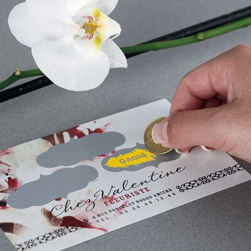 L'encre à gratter assure l'intérêt du lecteur et sa curiosité. à positionner sur certaines zones définies : un téléphone, du texte, un logo... le texte caché est identique pour toutes les cartes.
