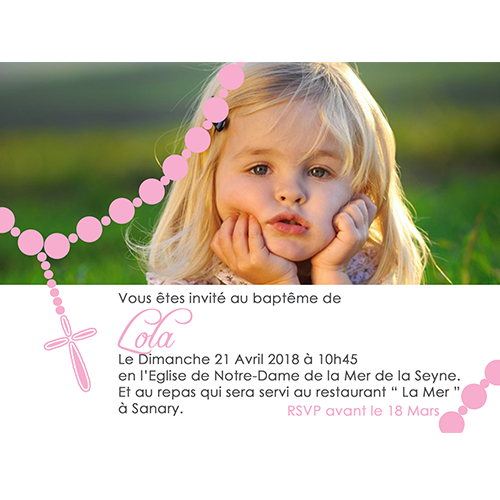 Les faire-part baptême sont personnalisés sur le thème que vous souhaitez avec ou sans photos ; ils sont imprimés à partir de vos fichiers ou de notre création.